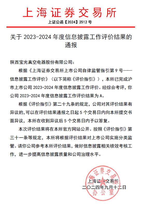 日前,上海證券交易所(以下簡稱上交所)發布了《滬市上市公司20232024年度信息披露工作評價結果》,寶光股份(600379)榮獲信息披露工作最高考核評級A級,這是公司首次獲此榮譽,是上交所對寶光股份信息披露、公司治理、投資者關系管理、履行社會責任等方面的高度認可和肯定。